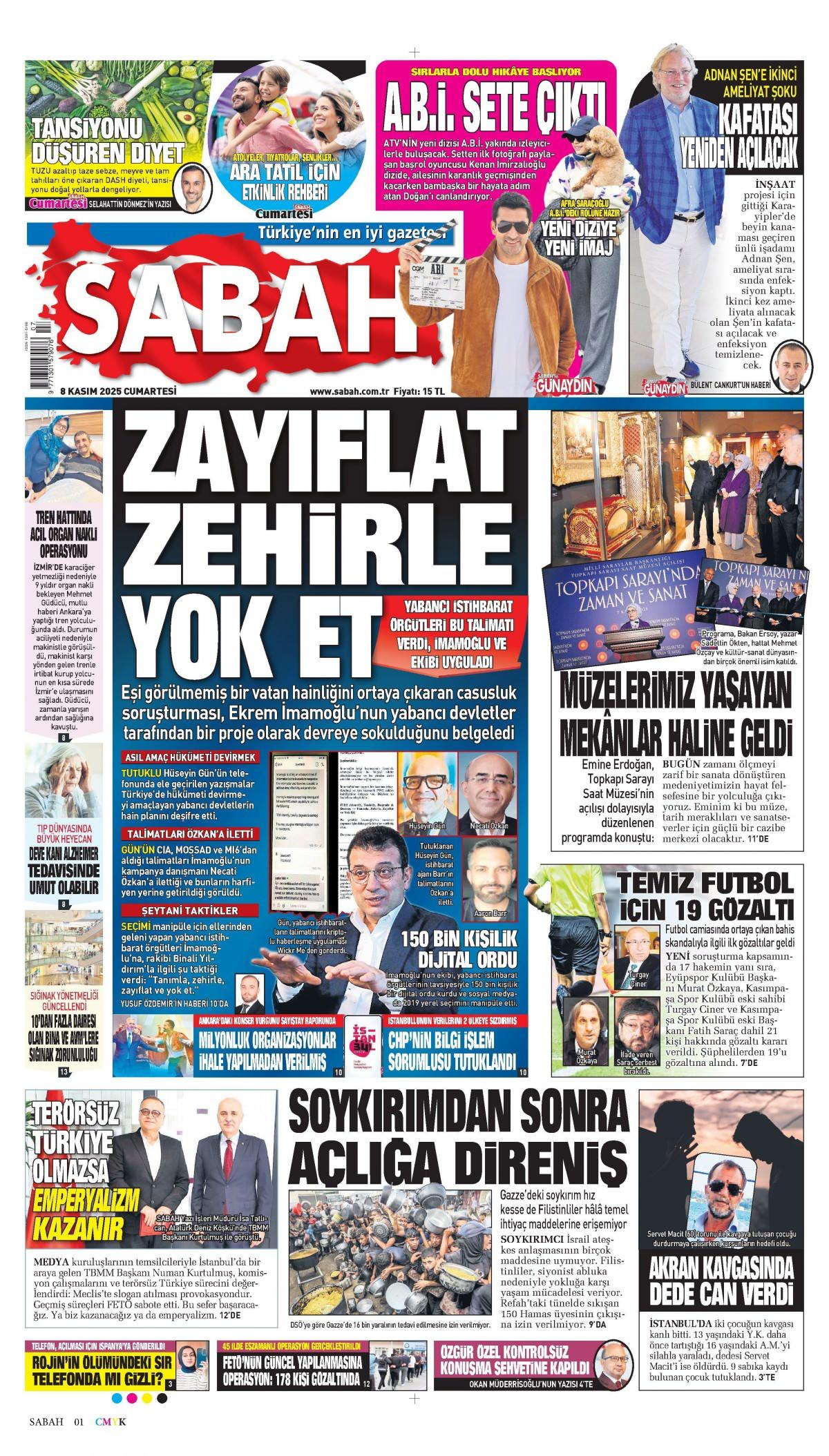 Sabah Gazetesi 8 Kasım 2025 Günü Manşeti